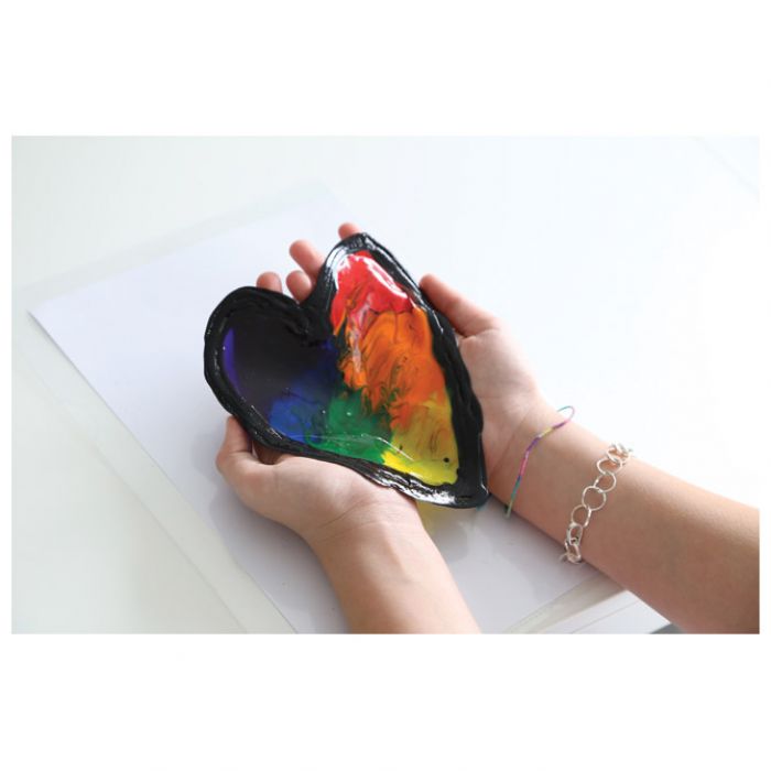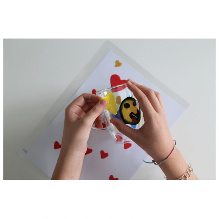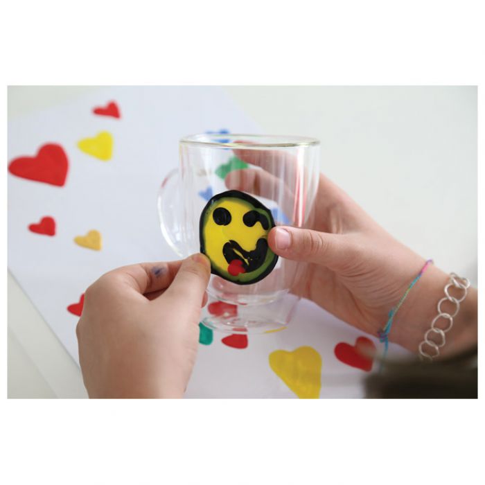 Specifikacija: u boci s mlaznicom za kontrolu protoka; visokokvalitetna emulzija u boji idealna je za stvaranje oblika koji se mogu premještati s jednog mjesta na drugo i lijepiti se na različite vrste staklenih površina nakon što se potpuno osuše; tonove možete miješati štapićem; rezultati su uvijek intenzivni, prozirni i svijetli; jednom kad se osuši boja se ne može isprati; primjena: staviti željenu šablonu (isprintani crtež) ispod prozirne čvrste folije i konturnom bojom iscrtati konture slike, a kada se konturna boja osuši tada između nanositi željene boje; sadrži: 6 boja (bijela, crna, crvena, plava, zelena i žuta) x 75 ml, plastičnu podlogu (dimenzija: 60x80 cm), 1 list šablona i upute; u plastičnoj kutiji; sa ručkom